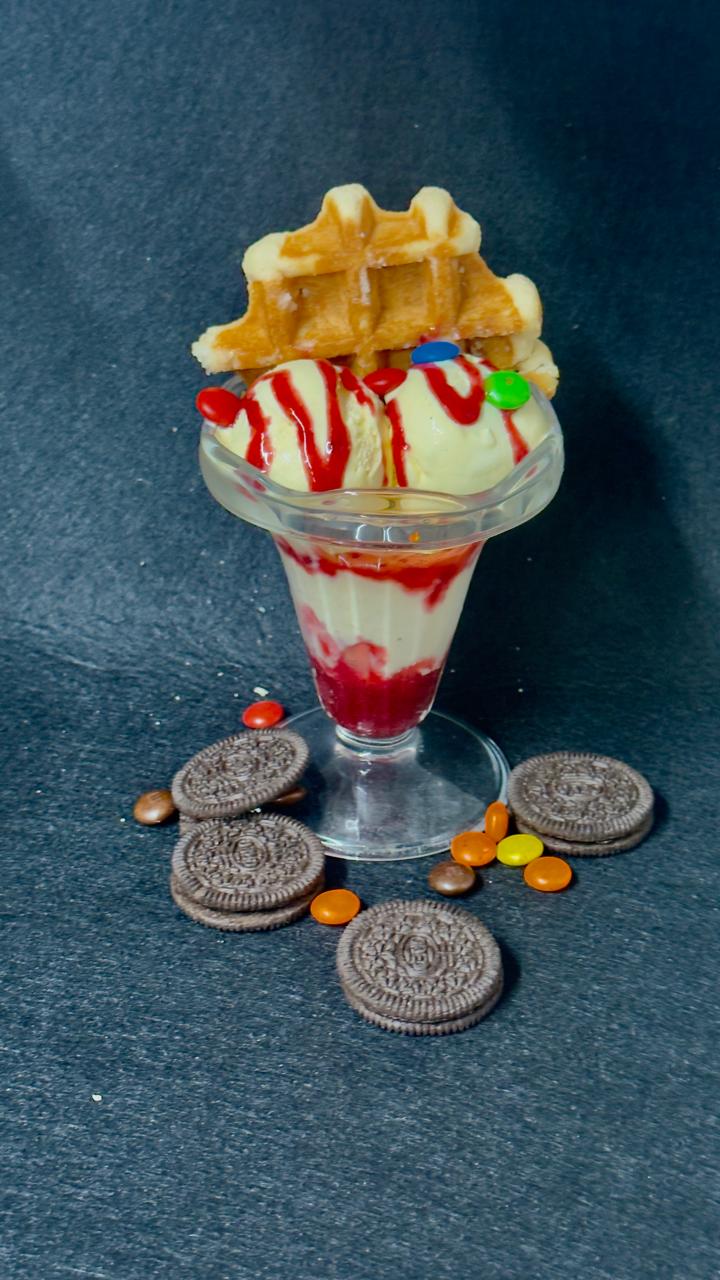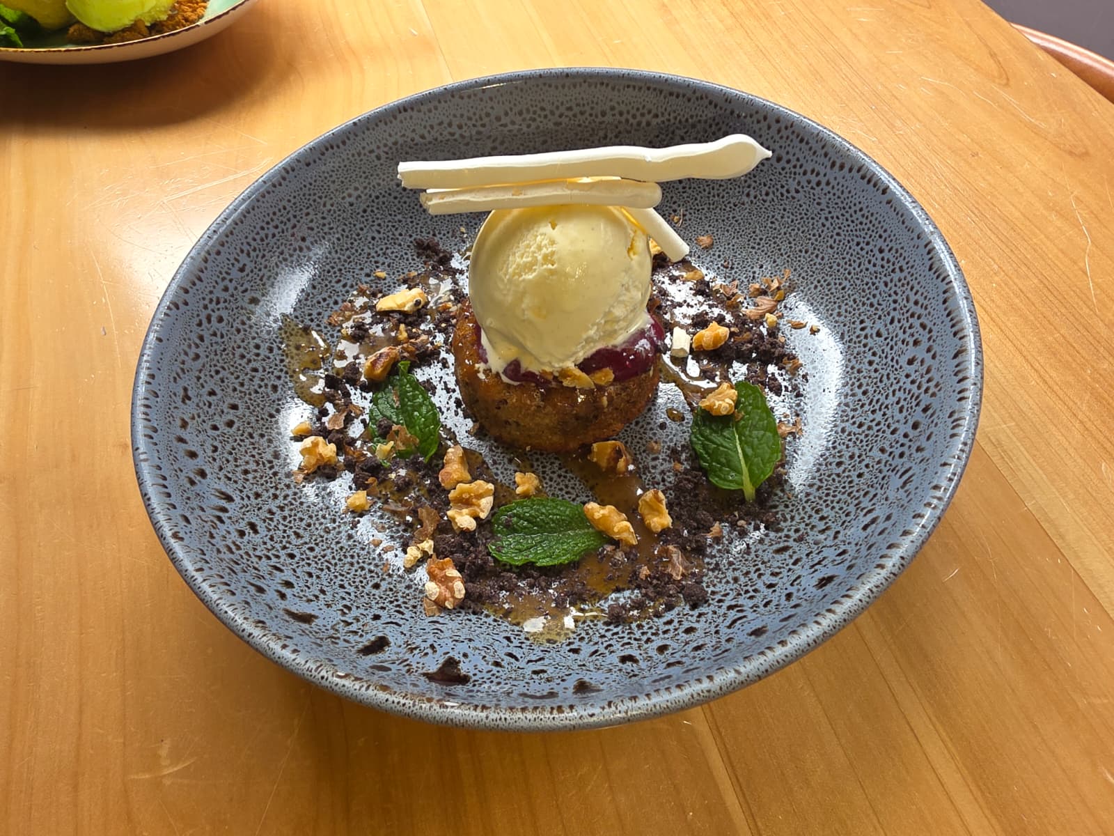 Gluten-free banana bread, red fruit coulis, vanilla ice cream, chocolate soil, caramelized nuts.