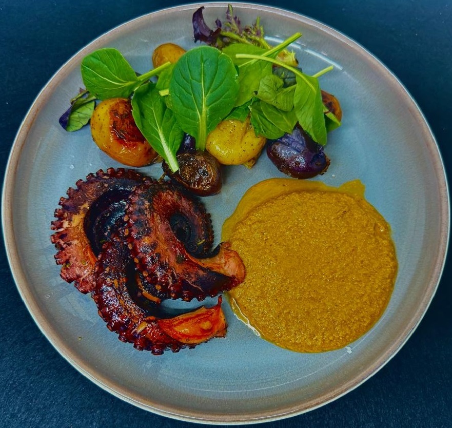 ½ Octopus in garlic butter, baby potatoes, Kashmiri chimichurri, pumpkin seed sauce.