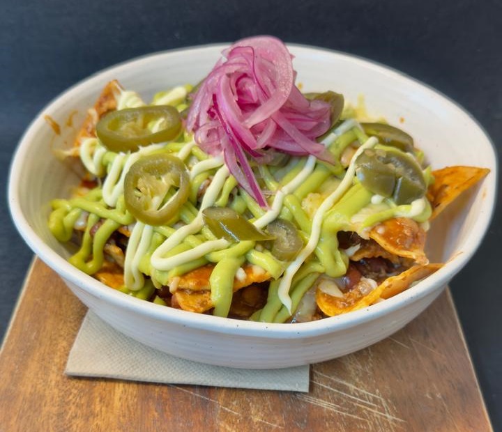Sourdough bread, mixed greens, roasted cherry tomatoes, guacamole, cheese crust, fresh onion, fries.