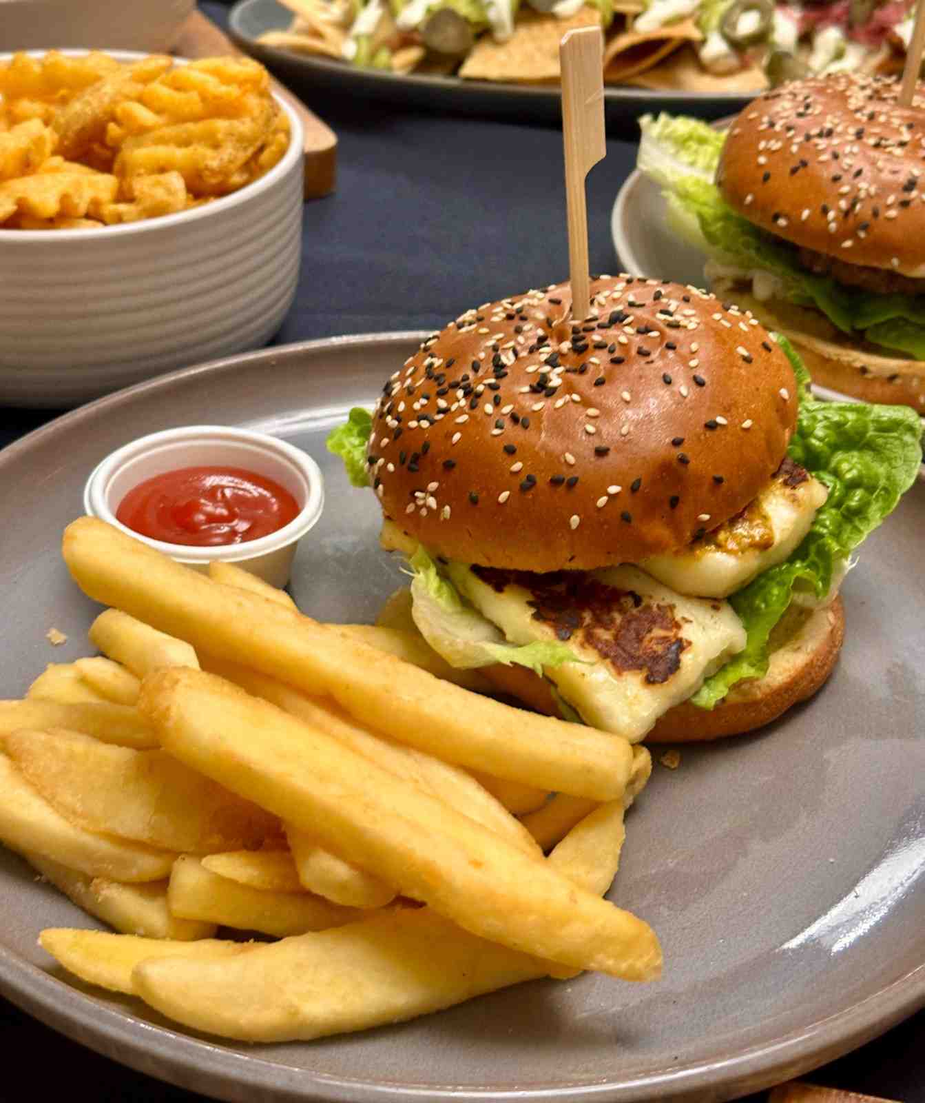 Portobello mushroom, halloumi cheese, capsicum pesto, garlic & parsley brioche, caramelized onion, pickles, fresh lettuce served with fries & tomato sauce.